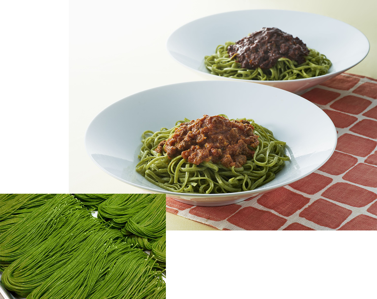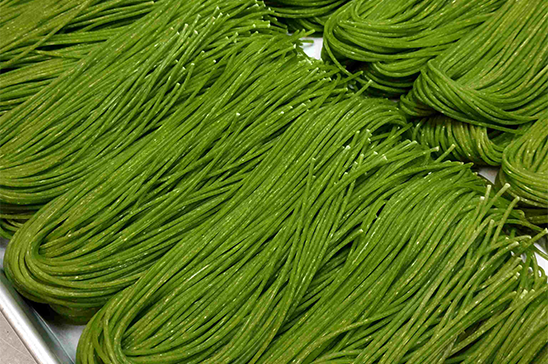 地元ふなばしの名産野菜「小松菜」を生パスタに練り込みました。 西船橋ひらの農園 平野さんが、規格外野菜の有効活用から生まれた「小松菜パウダー」を使用。 小松菜パスタ1食に、大きめの生小松菜1茎が使用されている栄養価の高い逸品です。
